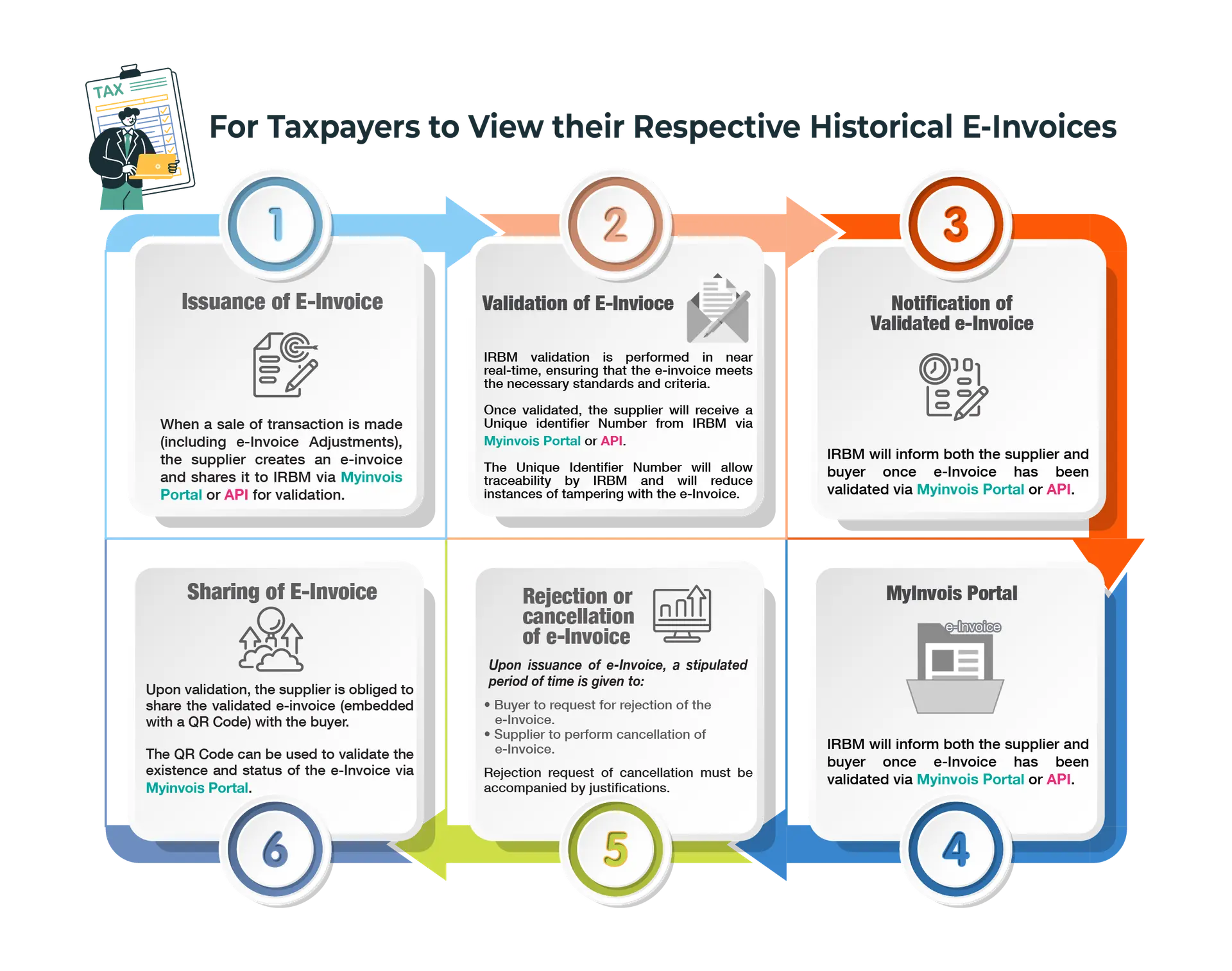 The figure below demonstrates an overview of the e-Invoice workflow from the point a sale is made or transaction is undertaken, and an e-Invoice is issued by the supplier via MyInvois Portal or API, up to the point of storing validated e-Invoices on IRBM’s database for taxpayers to view their respective historical e-Invoices.